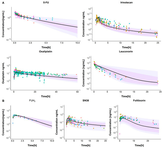During a second step, active metabolites were included in the initial models to understand their behavior in the physiological structure. The typical model performance of the expanded models accurately captured the observations. The variability in observations was successfully described for FUH2 and folitixorin, whereas the SN38 model failed to capture all the data. This discrepancy could be attributed to the sparse data on SN38 sourced from the literature.