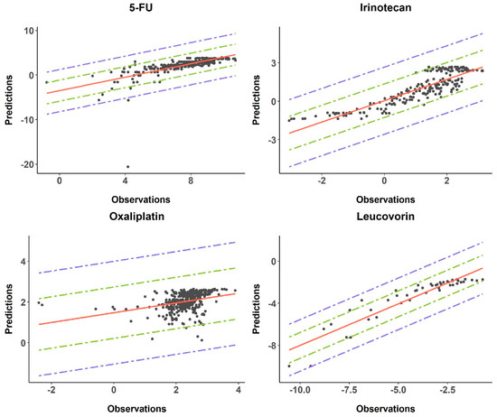 Figure 4 displays the goodness-of-fit plots delineating the performance of the individual drug models. The percentage of observations falling within the two-fold error bounds, delineated by the blue dashed lines in the figure, are as follows: 100%, 94%, 100%, and 96% for irinotecan, 5-FU, oxaliplatin, and leucovorin, respectively. Additionally, the percentage of observations situated within the fold-error lines, drawn in green dashed lines in the figure, are as follows: 97%, 61%, 94%, and 72% for irinotecan, 5-FU, oxaliplatin, and leucovorin, respectively.