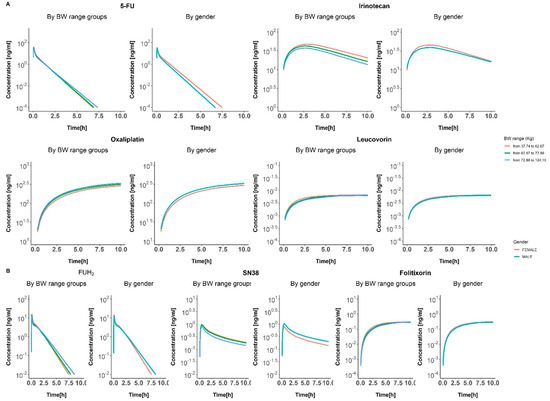 Additionally, as reported in previous studies on pharmacokinetic (PK) models of these drugs [67], certain covariates can influence the outcomes. The most important covariates identified in these earlier models are gender and body weight. Simulations were conducted to determine how covariates such as gender and body weight affect the concentration–time profiles in the target site, specifically the colon.