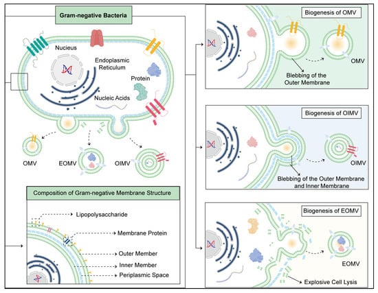 The biogenesis of OMVs involves complex cellular processes orchestrated by bacterial envelope machinery [17]. Understanding the intricacies of OMV biogenesis is essential for harnessing these vesicles for various biomedical applications, including cancer treatment [18]. In this overview, we delve into the key steps and regulatory mechanisms underlying OMV biogenesis (Figure 1).