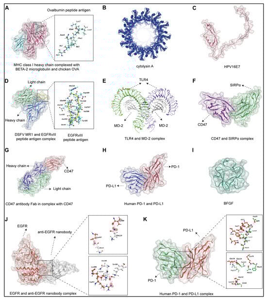 The structures of proteins shown by the molecular operating environment (MOE). (A) MHC class I heavy chain (red) complexed with BETA-2 (blue) macroglobulin and chicken ovalbumin (green). The top right picture shows the structure and amino acid compounds. (B) The protein structure of cytolysin A. (C) The predicted protein structure of HPV16E7. (D) DSFV MR1 (the heavy chain and light chain are marked blue and green, respectively) and the EGFRvIII peptide antigen (yellow) complex. The EGFRvIII peptide antigen structure and amino acid compounds are shown at the top right. (E) Structures of TLR4 (violet and green) and the MD-2 complex (grey). (F) The protein structures of the CD47 (violet) and SIRPα (green) complexes. (G) The complex protein structure of the CD47 antibody Fab (the heavy chain is marked in violet, and the light chain is marked in green) in complex with CD47 (red). (H) The human protein structure complex of PD-1 (red) and PD-L1 (violet). (I) The protein structure of BFGF. (J) The molecular docking results revealed the interaction between EGFR and the EGFR nanobody. (K) Interaction analysis via the MOE revealed the interaction between human PD-1 and PD-L1.