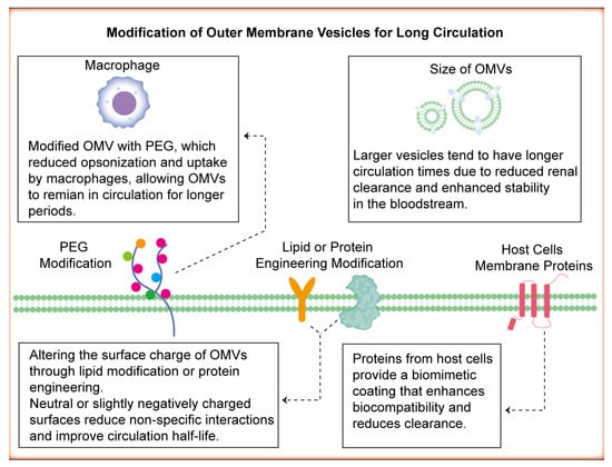 Modified OMVs for extended circulation time in the bloodstream. PEGylation can effectively reduce macrophage phagocytosis of OMVs. Controlling the size of OMVs can influence their circulation kinetics. Modifications with host-derived membrane proteins can effectively prevent immune recognition and clearance. Furthermore, lipid and protein engineering modifications influence the surface charge of OMVs.
