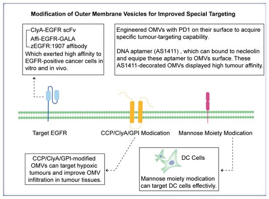 Modification of outer membrane vesicles to improve special targeting. The scFv-targeting EGFR, combined with ClyA modification, exhibits high efficiency in EGFR targeting. PD-1 and AS1411 modifications on the surfaces of engineered OMVs can specifically target tumour cells. Modifications such as ClyA/OmpA can enhance infiltration in tumour tissues. Additionally, modification with the mannose moiety can specifically target DC cells.