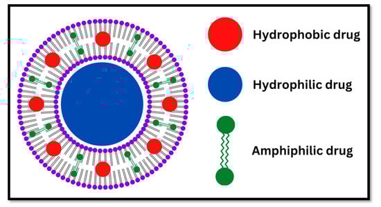 The structure of niosomes is unique as shown in the figure. The hydrophilic, hydrophobic, and amphiphilic drug molecules are encapsulated.