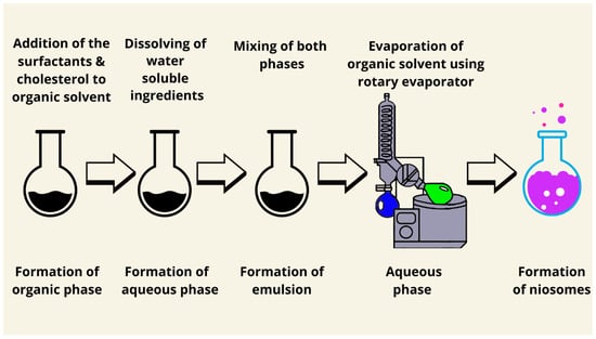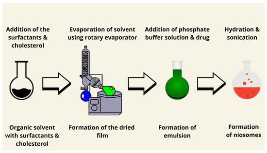 One of the conventional methods to prepare niosomes is thin-film hydration, also known as a lipid thin-film hydration method or the hand shaking method (Figure 2). Surfactants and lipids in different ratios are generally dissolved in a suitable organic solvent. Then, a thin film was created after the evaporation of the solvent by using a rotary evaporator under reduced pressure [64]. The obtained film should later be dispersed in an aqueous solution. Upon hydration at a temperature slightly above the phase transition temperature of the surfactants used for a period of time—with occasional gentle shaking (hydration time)—the lipids swell and peel off the wall of the circular-bottomed flask [65]. The addition of the drug (active ingredient) depends on the nature and solubility of the drug. If the drug is hydrophobic, it should be added to the mixture of surfactants and lipids. When the drug is hydrophilic, it is mixed with a hydration mixture. Multilamellar vesicles (MLVs) are formed by hand shaking, while large unilamellar vesicles (LUVs) are produced by non-shaking [8,66]. This type of method does not require any sophisticated technique. Moreover, different types of molecules can be prepared using thin film hydration methods, such as hydrophobic molecules and hydrophilic molecules. Examples of hydrophobic molecules are methylene blue [67], cinnarizine [68], and etoricoxib [69]. Examples of hydrophilic molecules are atenolol [70], fluconazole [71], and vancomycin [72]. Furthermore, Machado et al. (2018) claimed that the thin film hydration method may produce niosomes with good entrapment efficiency values for hydrophilic molecules [73]. This technique is appropriate for the encapsulation of hydrophilic and lipophilic drugs. Hydrophilic drugs are better encapsulated in the aqueous phase, while lipophilic drugs integrate into the lipid bilayer. It produces multilamellar vesicles with high encapsulation efficiency but larger particle sizes and nonuniform distribution. Optimization techniques include sonication or extrusion to improve size uniformity. Charge-inducing agents such as stearyl amine and dicetyl phosphate may enhance the particle stability, release, and delivery of the drug to a specific location in the human body. Hydration temperature is a very important factor affecting bilayer fluidity and encapsulation efficiency, especially for thermosensitive drugs.