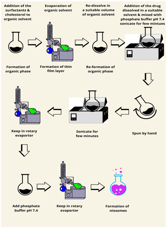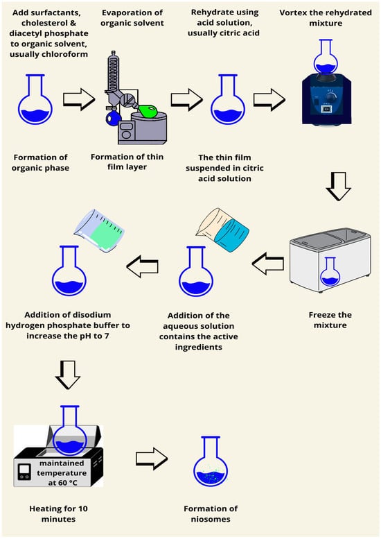 In this procedure, the surfactant and cholesterol are dissolved in equal parts in an organic solvent (the researcher used chloroform), and the organic solvent is then extracted at decreased pressure to generate a thin film-like lipid layer. An acidic solution, often citric acid, should be added to the formed thin film and vortexed. An aqueous solution contains the drug and is then added and thoroughly mixed by vortexing after freezing. Disodium hydrogen solution is used to bring the pH of 7 to 7.2. the mixture should be heated using a water bath for 10 min at a maintained temperature of 60–62 °C to form the niosomes [87,88]. Small unilamellar vesicles should be produced using this method (Figure 11). This method uses a pH gradient in order to drive the encapsulation of drugs into vesicles, very successful in weakly basic drugs. The buffer composition and pH stability are relevant in making sure that high drug encapsulation is maintained over time. The targeted delivery of chemotherapeutics inside acidic tumor microenvironments, accordingly, has enhanced its biomedical relevance in oncology medicine.