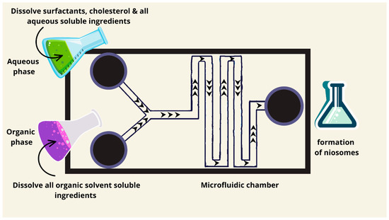 The microfluidics method is gaining interest as a novel production technology for nanoparticles, particularly niosomes (Figure 5). The idea of the microfluidics method originated in 1947 and the first use of microfluidic channels was in the 1990s. The adoption of microfluidic technology also occurred in the 1990s [78]. The production of niosomes can be carried out using microfluidics devices. It consists of side channels alongside central channels. Both the organic and aqueous phases are pumped in different channels under pressure at a specific flow rate to an ice-filled interaction chamber. The niosomes are usually collected from the mixing channels using a glass vial [20]. Uniform, small size, and cholesterol-niosomes are produced using this method [50]. Based on Noelia et al. (2020), the niosomes produced by the microfluidics method are smaller in diameter compared to those produced by the thin film hydration method [50]. Other advantages that can be observed when using the microfluidics method are as follows: the control of the input variables, minimal chemical usage, and the possibility of scaling up noisome production [79]. Microfluidics enables the controlled synthesis of small and uniform niosomes through precisely monitored flow rates of aqueous and organic phases in microchannels. This technique is perfect for generating vesicles with minimum dispersity in size and cholesterol-free formulations, which are important for targeting active drug delivery. The flow rate ratio directly affects particle size and stability. Recent developments have shown great promise regarding the encapsulation of biomolecules such as mRNA and siRNA, making the technique highly relevant to gene therapy.