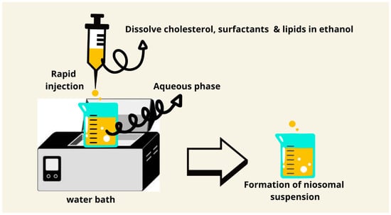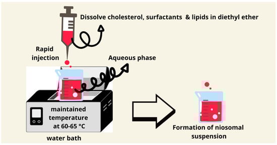 The ether injection method was introduced by Deamer and Bangham in 1976 [65]. It involves the dissolving of the nonionic surfactants and other ingredients in diethyl ether and the injection of this mixture in an aqueous solution with a maintained temperature of 60–65 °C. The difference in the temperature between organic and aqueous phases will allow the solvent to evaporate. Inexpensive large unilamellar niosomes types are produced using this method. The downsides of this approach include the presence of a small quantity of ether in the vesicle’s suspension, which can be difficult to remove (Figure 7). The ether injection technique produces niosomes upon the injection of an ether solution of lipids into a heated aqueous phase; the slow evaporation of ether allows the formation of a bilayer. Due to the higher solubility of lipophilic drugs in ether, this method is very suitable for them. Residual ether can be minimized by using evaporation under reduced pressure, which improves its safety profile for pharmaceutical applications [81,82,83].