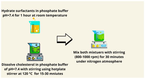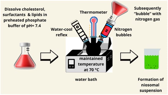 Surfactants and other lipids are dissolved in a phosphate buffer of pH = 7 for 1 h. In a heat-resistant container, dissolve cholesterol in phosphate buffer at 120 °C under continuous stirring for 15–30 min using a hot-plate stirrer. Mix both mixtures with the aid of heating and stirring (800–1000 rpm) for 30 min under a nitrogen atmosphere (Figure 12) [89]. However, it involves the mixing of surfactants and lipids in a phosphate buffer at high temperatures; because of its simplicity, it is suitable for the preparation of large vesicles. Incorporation of antioxidants such as tocopherol can minimize thermal degradation during preparation, enhancing its applicability for heat-sensitive drugs. This technique has especially been effective for hydrophobic drugs, where a high lipid solubility is required, presenting an economical solution for general drug encapsulation.