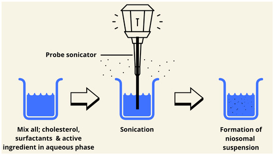 The sonication method is a green technology to prepare niosomes. It is a simple, low-cost method, and does not need the use of organic solvents. Briefly, the aqueous phase and the medication are combined with surfactant and cholesterol. The mixture is sonicated for a few minutes at 60 °C using a titanium probe sonicator. The niosomes are usually collected by filtration using filter papers or by freeze-drying. The major advantage of this method is that the niosomes produced are very small in size without using any type of organic solvent [85,86]. Based on the above statement, this method is not a suitable candidate for water-insoluble drugs. This method could produce small multilamellar vesicles (Figure 9 and Figure 10) [62].