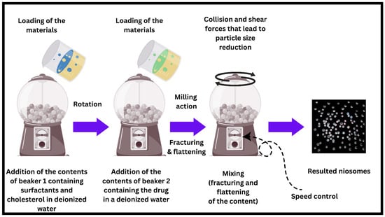 The new and novel ball milling (BM) method is a prominent technique with significant potential for enhancing the quality and efficiency of niosome manufacturing. Incorporating a specialized methodology entails the employment of a receptacle housing spherical entities within the manufacturing procedure of niosomes. The utilization of this technique facilitates the generation of niosomes possessing accurate and adaptable dimensions and configurations, thereby allowing for customization to attain specific drug release profiles. The application of the BM process demonstrates promise in addressing the inherent constraints of traditional niosome manufacturing techniques through its ability to offer better regulation of size consistency and enhanced encapsulation efficiency. Therefore, this can lead to a drug administration system that is both more accurate and efficient, as depicted in Figure 13. To facilitate a more thorough elucidation, it is imperative to suspend the pharmaceutical agent within deionized water (or any other suitable solvent) in a suitable container. Concurrently, the span and cholesterol compounds are submerged in deionized water (or any other suitable solvent) in a separate container. Following this, the contents of both containers are merged and methodically introduced into a milling container that contains numerous balls. The initiation of a mechanistic cascade occurs when the milling container is rotated, resulting in the application of rotational force that exerts pressure on the drug and surfactant particles, leading to their fracturing and compression. The aforementioned procedure ultimately culminates in the synthesis of niosomes [90]. Ball milling would apply mechanical forces that assure uniform dispersion of surfactants and lipids, hence providing improved stability. Smaller milling balls and higher rotation speeds increase particle uniformity. Further refinement in vesicle size for specific drug delivery applications can be achieved with the use of microfluidic post-processing, hence combining with this technique and holding great promise as a scalable technique. While traditional methods like thin film hydration give rise to less homogeneous, larger particles or reverse phase evaporation is made up of intricate steps, the method of BM ensures ease of the process and provides greater reproducibility. This means that to give better particle size (customizable particle size by controlling the rotation speed of the ball mill) and encapsulation efficiency, this technique should greatly contribute to the area of drug delivery. To our knowledge, the ball milling method idea comes from the ball mill machine. The ball mill, an essential tool in mineral processing and other industries, operates on the impact and attrition principle. The input material is reduced in size because of cascading collision events between the media and the feed within a rotationally driven, cylindrical chamber filled with grinding media (typically steel balls or ceramic spheres). It is possible to achieve a wide range of particle sizes and processing levels by adjusting parameters such as rotation speed, ball-to-sample ratio, and grinding media size. The ball mill’s applications range from ore comminution to the synthesis of advanced nanomaterials, cement grinding, and even pharmaceutical production, demonstrating its versatility. Its continued use in academic and industrial settings demonstrates its effectiveness and adaptability in addressing a wide range of milling and grinding challenges.