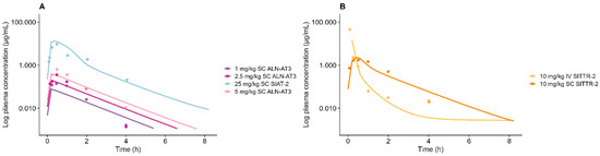 Model-simulated plasma concentration profiles vs. observed data for GalNAc-siRNAs (A) targeting antithrombin (ALN-AT3/SIAT-2) and (B) targeting transthyretin protein (SITTR-2). Solid lines represent model simulations, and dots represent observations. (A) Dark purple line represents 1 mg/kg of subcutaneously administered ALN-AT3, dark pink represents 2.5 mg/kg of subcutaneously administered ALN-AT3, light pink line represents 5 mg/kg of subcutaneously administered ALN-AT3, and light blue line represents 25 mg/kg of subcutaneously administered SIAT-2. (B) Orange line represents 10 mg/kg of subcutaneously administered SITTR-2, and yellow line represents 10 mg/kg of intravenously administered SITTR-2.