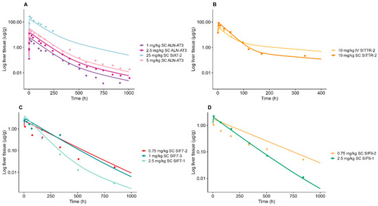 Model-simulated liver tissue distribution vs. observed data for GalNAc-siRNAs (A) targeting antithrombin (ALN-AT3/SIAT-2), (B) targeting transthyretin protein (SITTR-2), (C) targeting factor 7, and (D) targeting factor 9. Solid lines represent model simulations, and dots represent observations. (A) Dark purple line represents 1 mg/kg of subcutaneously administered ALN-AT3, dark pink represents 2.5 mg/kg of subcutaneously administered ALN-AT3, light pink line represents 5 mg/kg of subcutaneously administered ALN-AT3, and light blue line represents 25 mg/kg of subcutaneously administered SIAT-2. (B) Orange line represents 10 mg/kg of subcutaneously administered SITTR-2, and yellow line represents 10 mg/kg of intravenously administered SITTR-2. (C) Red line represents 0.75 mg/kg of subcutaneously administered SIF7-2, blue line represents 1 mg/kg of subcutaneously administered SIF7-3, and light green line represents 2.5 mg/kg of subcutaneously administered SIF7-1. (D) Light orange line represents 0.75 mg/kg of subcutaneously administered SIF9-2, and green line represents 2.5 mg/kg of subcutaneously administered SIF9-1.