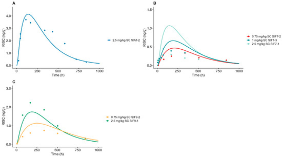 Model-simulated siRNA-induced RISC formation vs. observed data measured as antisense strand loaded into Ago2 for GalNAc-siRNAs targeting (A) antithrombin (SIAT-2), (B) factor 7 (siF7-1/2/3), and (C) factor 9 (siF9-1/2). Solid line represents model simulation, and dots represent observed data points. (A) Dark blue line represents 2.5 mg/kg of subcutaneously administered SIAT-2. (B) Red line represents 0.75 mg/kg of subcutaneously administered SIF72, blue line represents 1 mg/kg of subcutaneously administered SIF73, and light green line represents 2.5 mg/kg of subcutaneously administered SIF7-1. (C) Light orange line represents 0.75 mg/kg of subcutaneously administered SIF9-2, and green line represents 2.5 mg/kg of subcutaneously administered SIF9-1.