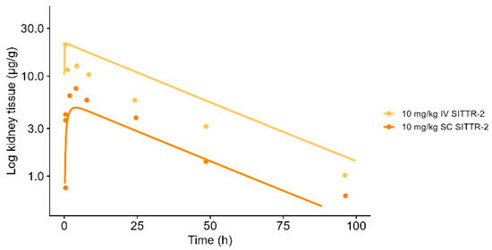 Model-simulated kidney tissue distribution vs. observed data for GalNAc-siRNA targeting transthyretin protein (SITTR-2). Solid line represents model simulation, and dots represent observed data points. Orange line represents 10 mg/kg of subcutaneously administered SITTR-2, and yellow line represents 10 mg/kg of intravenously administered SITTR-2.