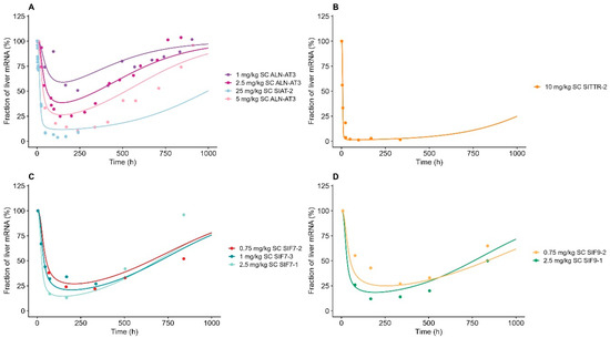 Model-simulated percentage liver mRNA silencing vs. observed data for GalNAc-siRNAs (A) targeting antithrombin (ALN-AT3/SIAT-2), (B) targeting transthyretin protein (SITTR-2), (C) targeting factor 7 (siF7-1/2/3), and (D) targeting factor 9 (siF9-1/2). Solid line represents model simulation, and dots represent observed data points. (A) Dark purple line represents 1 mg/kg of subcutaneously administered ALN-AT3, dark pink represents 2.5 mg/kg of subcutaneously administered ALN-AT3, light pink line represents 5 mg/kg of subcutaneously administered ALN-AT3, and light blue line represents 25 mg/kg of subcutaneously administered SIAT-2. (B) Orange line represents 10 mg/kg of subcutaneously administered SITTR-2. (C) Red line represents 0.75 mg/kg of subcutaneously administered SIF72, blue line represents 1 mg/kg of subcutaneously administered SIF7-3, and light green line represents 2.5 mg/kg of subcutaneously administered SIF7-1. (D) Light orange line represents 0.75 mg/kg of subcutaneously administered SIF9-2, and green line represents 2.5 mg/kg of subcutaneously administered SIF9-1.