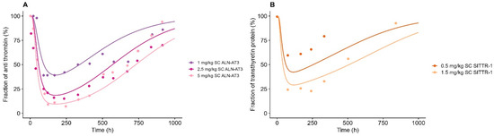Model simulations of the percentage downstream effect on target protein vs. observed data measured as serum antithrombin and serum transthyretin for GalNAc-siRNAs (A) targeting antithrombin (ALN-AT3/SIAT-2) and (B) targeting transthyretin protein (SITTR-1). Solid line represents model simulation, and dots represent observed data points. (A) Dark purple line represents 1 mg/kg of subcutaneously administered ALN-AT3, dark pink represents 2.5 mg/kg of subcutaneously administered ALN-AT3, and light pink line represents 5 mg/kg of subcutaneously administered ALN-AT3. (B) Dark orange line represents 0.5 mg/kg of subcutaneously administered SITTR-1, and yellow line represents 1.5 mg/kg of subcutaneously administered SITTR-1.