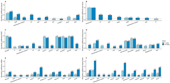 Model sensitivity analysis of PBPK parameters measured as the change in area under the curve (AUC) (ug·h/mL) simulated from time 0 h to time 1000 h (AUC0–1000h) for 1 mg/kg (light blue bars) and 25 mg/kg (dark blue bars) in (A) plasma, (B) liver tissue, (C) siRNA-induced RISC, (D) kidney tissue, (E) mRNA silencing, and (F) downstream effect on target protein. Positive sensitivity coefficient denotes an increase in AUC0–1000h when the investigated parameter is increased by 10%. Negative sensitivity coefficients denote a decrease in AUC0–1000h when the investigated parameter is increased with 10%. Dashed line signifies the threshold of 0.1 used to assess the minimum impact of the PBPK parameter.