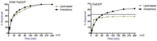 No degradation was noticed with the two formulations in any neutral medium. Concerning acid media, no degradation was detected by using amorphous or lipid-based formulations in HCl 0.1 N and in FaSSGF, while high degradation was observed in HCl 0.1N + 0.5% SLS for both formulations. Only FaSSIF sink, phosphate buffer pH 6.8 + 0.5% SLS and FeSSIF enabled us to reach complete dissolution.