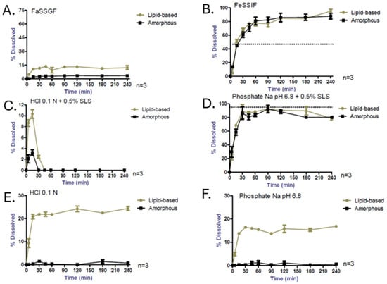 Non-sink dissolution tests of lipid-based and amorphous formulations (n = 3) in FaSSGF (A), FeSSIF (B), HCl 0.1N + 0.5% SLS (C), phosphate Na pH 6.8 + 0.5% SLS (D), HCl 0.1N (E) and phosphate Na pH 6.8 (F). Dashed lines represent the CBD’s maximum solubility. Please note the scale differences.