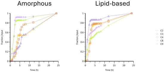 The CBD content in all formulations used in this study was between 95 and 105%. Dissolution tests may be performed under sink or non-sink conditions depending on the purpose of the test. The release rates of both formulations in FaSSIF medium under sink conditions are presented with the release rates under non-sink conditions (Figure 1). Under sink conditions, both amorphous and lipid-based formulations enabled a fast and complete CBD release []. By using non-sink conditions, the two formulations showed different dissolution behavior with a burst release followed by rapid equilibrium under the saturation concentration for the lipid-based formulation in contrast with the amorphous formulation.