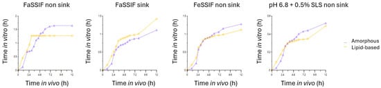 These results show that the use of FaSSIF medium under non-sink conditions is not optimal and leads to differences between formulations. Different shapes between the two formulations are spotted with a plateau formed with the lipid-based system after a fast initial release. The use of phosphate buffer pH 6.8 added with SLS also provided shapes closer to FeSSIF. FaSSIF sink and FeSSIF media enabled better similarity between the shape of curves.
