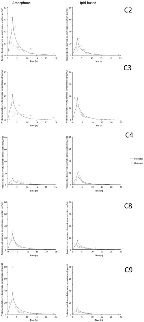 Plasma concentration–time curves of predicted and observed values in FeSSIF medium and by using common time scaling. C2–C4, C8 and C9 correspond to the five different animals.