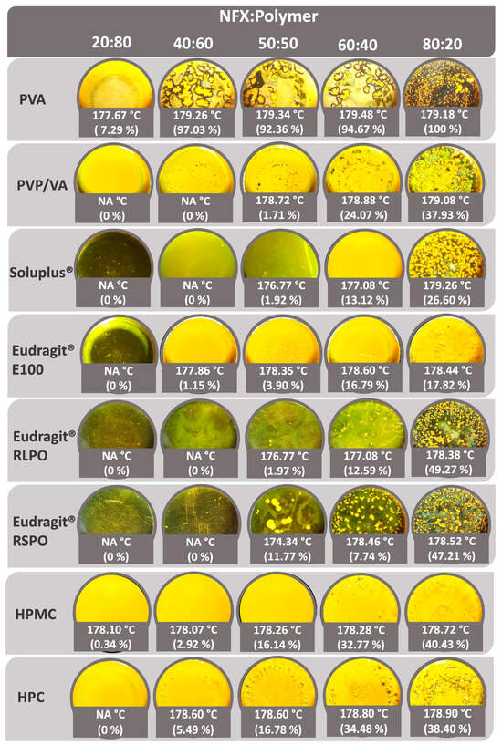 The film casting of pharmaceutical-grade polymers. Melting temperature peak and relative degree of crystallinity of NFX, expressed in °C and as a percentage, respectively, are shown. Images at 2× magnification. NA: not available.