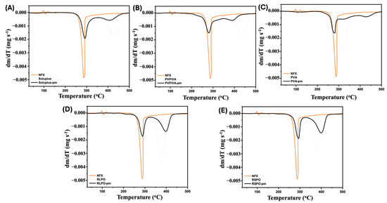 Binary equimass physical mixtures of NFX and selected polymers were prepared (RSPO-pm, RLPO-pm, Soluplus-pm, PVP/VA-pm, and PVA-pm) and analyzed by thermogravimetric analysis (TGA) to obtain information about the stability of the samples from their decomposition profile. Samples were heated from 30 to 500 °C in platinum pans under a N2 atmosphere, with a heating rate of 10 °C min−1 (DTG-60H, Shimadzu, Kyoto, Japan).