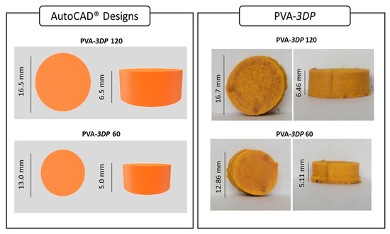 Extrudate filaments for FDM 3D printing must be plastic enough to be feedable and avoid breaking during the feeding process, while not being so soft that they cannot be pushed through the equipment [51,52,53]. Accordingly, PVA-fil met the printing requirements, and cylindrical tablets were successfully printed (Figure 4). For 120 mg printed tablets (PVA-3DP 120), the measured dimensions were 16.70 mm (±0.43) × 6.46 mm (±0.07), and the average weight was 1.25 g (±0.03). The 60 mg printed tablets (PVA-3DP 60) had a diameter of 12.86 mm (±0.60) and 5.11 mm (±0.10) thickness, with an average weight of 0.64 g (±0.04).
