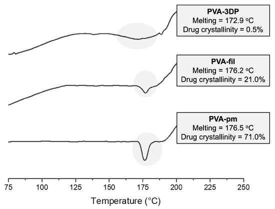 A thermal characterization of the tablets was performed, as shown in Figure 5. The drug crystallinity is reduced even in the physical mixture (PVA-pm = 71.02%), due to an interaction effect of the drug with the formulation during the heating of the DSC analysis [54]. The extrusion process, in turn, as previously mentioned, produced an extensive reduction in the drug crystallinity in PVA-fil (21.04%). The second heating of the sample after the 3D-printing process accentuated the degree of amorphization of NFX, which reached almost total sample amorphization. In this case, the higher degree of drug amorphization is possibly caused by additional heating to higher temperatures.