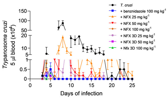 Parasitemia curves in mice infected by T. cruzi treated with benznidazole, NFX, or 3D-printed NFX tablets. The curve represents the number of circulating parasites in Swiss mice over a 25-day infection period. Each treatment group consisted of six animals.