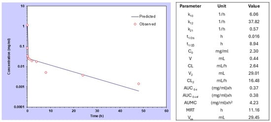 Compartmental analysis and pharmacokinetic data of P-(Esbp)-IR783 in healthy mice after intravenous bolus injection.