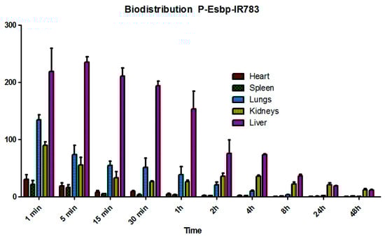 P-(Esbp)-IR783 accumulated significantly in the liver of healthy mice, and a substantial amount of polymer was also detected at the first 4 h in the lungs and kidneys (Figure 3). Detectable levels were observed in the liver and kidneys even 48 hours post-injection. The liver, lungs, and kidneys are characterized by high tissue perfusion and discontinuous vascular walls (these fenestrae are generally between 50 and 100 nanometers in diameter) that allow substances circulating in the plasma to extravasate. These results align with other examples of polymer–drug conjugates or nano-sized formulations, such as liposomes, polymeric micelles, and nanoparticles []. The significant perfusion and accumulation of P-Esbp in the kidneys highlight its potential use for treating kidney diseases by targeting the E-selectin that is present at the luminal aspect of inflamed blood vessels. Since E-selectin expression levels are significantly up-regulated in response to inflammatory stimuli, P-Esbp may substantially accumulate in the blood vessels of the injured kidney and the renal localization is expected to be higher.