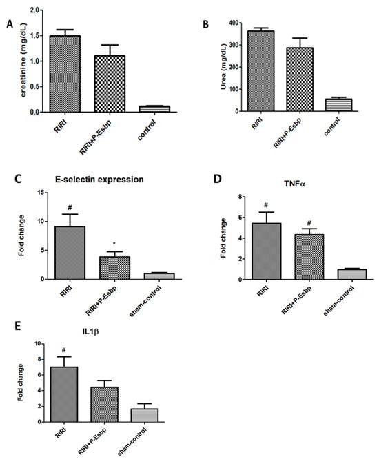 Effects of P-Esbp treatment (1 mg in 200 µL of saline at the time of reperfusion and 1 mg the following morning) on kidney function biochemical parameters—creatinine (A) and urea (B) 24 h after 25 min RIRI. Renal tissue expression levels of E-selectin (C), TNFα (D), and IL-1β (E) 24 h after 25 min RIRI. #—statistically significant difference compared to the sham-control group, p < 0.05; *—statistically significant difference compared to the RIRI group, p < 0.05.