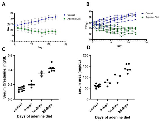 Adenine-fed C57BL/6 mice experienced a reduction in BW, which was more pronounced in the first week of feeding and stabilized in the following weeks (Figure 5A,B—individual profiles). This reduction in BW was comparable with that reported in the literature, and, on average, it was around 10% of the original weight [,]. The average food intake was 3.2 g of food per mouse per day in the control group and 2.2 g per mouse per day in the adenine group. Kidney injury was confirmed by elevated serum levels of creatinine and serum urea (Figure 5C,D) and their levels gradually increased throughout the course of the experiment.