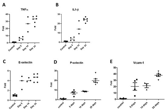 The inflammatory cytokines TNFα and IL-1β also showed a rising trend in mRNA expression (Figure 6A,B), with a gradual increase in their levels from day 5 to day 25. Endothelial CAMs are overexpressed in response to inflammation and signaling by cytokines. Our results showed that the CAMs E-selectin, VCAM-1, and P-selectin were up-regulated in kidney tissues of adenine-fed mice. The E-selectin levels were elevated at the earliest time point of 5 days and this trend continued for time points at 14 days and 25 days (Figure 6C), demonstrating the highest folds at the last time point (4.6-fold average). Both P-selectin (Figure 6D) and VCAM-1 (Figure 6E) expression levels were enhanced during the course of the experiment, and the fold increase in their mRNA levels was about 5–10-times higher than that of E-selectin.