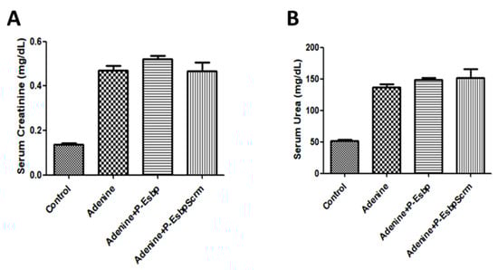 Effects of P-Esbp treatment (1 mg in 200 µL of saline i.p. every second day from day 6 of the experiment; total of ten doses) on kidney function biochemical parameters from the interventional experiment. Serum creatinine (A) and serum urea (B) upon animal euthanasia on day 28.