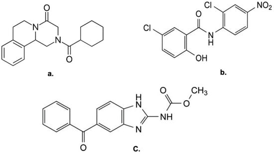 (a) Praziquantel, (b) niclosamide, and (c) mebendazole molecular structures.