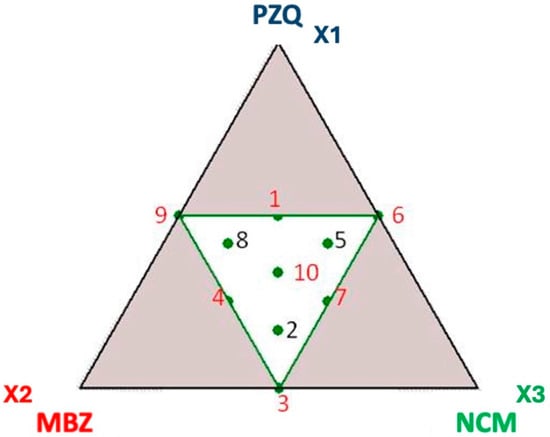 The mixtures subjected to grinding consisted of three powdered components: praziquantel (PZQ, X1), mebendazole (MBZ, X2), and niclosamide (NCM, X3). The limits of each component in the mixtures were defined during the preliminary trials obtaining the following values: 0 ≤ X ≤ 0.5 (expressed as a molar ratio in the mixture). In fact, the mixture design approach was used exclusively for exploratory analysis.