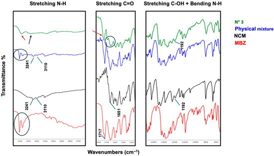 Turning to NCM, the functional group clearly involved in interactions is the N-H, as its stretching bands at 3241 and 3110 cm−1 [39], still visible in the physical mixture, completely disappear in the coamorphous spectrum. At 1651 cm−1 [40], the C=O stretching band shows broadening in the coamorphous spectrum, though its involvement in hydrogen bonding is less clear. Additionally, the C-OH stretching band at 1192 cm−1 [40] appears in both spectra, suggesting no interaction with this group. In conclusion, the N-H amide groups from both components and the MBZ amidic carbonyl appear to be involved in hydrogen bonding.