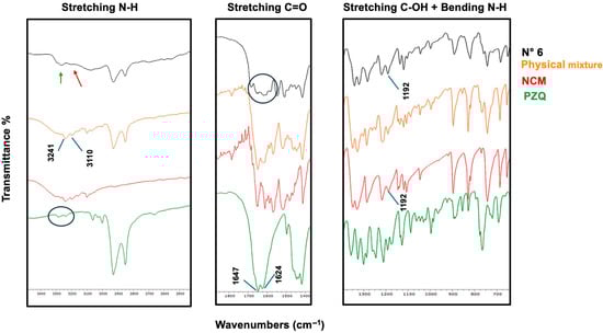 Also, the FT-IR of exp. N° 6 (i.e., binary PZQ-NCM 1–1) was useful to elucidate some possible interactions between the two components. The FTIR spectrum of the new coamorphous system exhibits the typical band-broadening characteristic of amorphous materials, differently from the pure crystalline components and the physical mixture. This broadening is particularly evident in the wavenumber region between 3241 and 3110 cm−1, where the N-H stretching bands of NCM are located [39], making it difficult to clearly determine whether the donor group is involved in hydrogen bonding. Additionally, the band at 1624 cm−1, corresponding to the C=O stretching of PZQ [24,30,41,42], disappears in the coamorphous spectrum, confirming the involvement of the carbonyl group as a hydrogen bond acceptor. Conversely, the C-OH stretching band of NCM at 1192 cm−1 [40] is still present in both the physical mixture and the coamorphous spectra, suggesting that this group is not acting as a hydrogen-bond donor. The broadening observed in the coamorphous spectrum makes it difficult to definitively identify all the groups involved in hydrogen bonding. However, a PZQ carbonyl group seems to be implicated as a hydrogen bond acceptor. Figure 4 shows the FT-IR spectra described above.