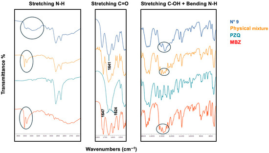 The FT-IR spectra of exp. N° 9 (i.e., binary PZQ-MBZ 1–1) are reported in Figure 5. By comparing the FT-IR spectra of the new coamorphous system, its physical mixture, and the individual components, the presence of solid-state interactions can be hypothesized. In the region related to PZQ carbonyl stretching vibrations, the coamorphous system merges into a single broad and shifted carbonyl band at 1641 cm−1, compared to the double peak at 1647 and 1624 cm−1 observed for anhydrous PZQ [24,30,41,42]. PZQ bands are still visible in the physical mixture, confirming that no interactions involving these functional groups occur in the simple mixture. Regarding MBZ, the sharp N-H amide stretching band at 3404 cm−1 [38], which is still prominent in the physical mixture, is absent in the coamorphous system. This could indicate that the N-H amide group participates in hydrogen bonding. Additionally, the band at 1278 cm−1, associated with the C-N stretch of the imidazole [38], shows significant broadening in the coamorphous spectrum, suggesting its involvement in interactions. In contrast, no such broadening is observed in the simple physical mixture.