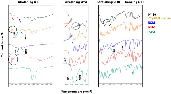 At this stage, some coground samples (all three binary systems plus one ternary system, i.e., exp. N° 3, 6, 9, and 10) were analyzed using FT-IR spectroscopy to investigate the presence of possible interactions between the components, which would indicate the formation of coamorphous systems rather than mere physical blends of the three amorphous components.