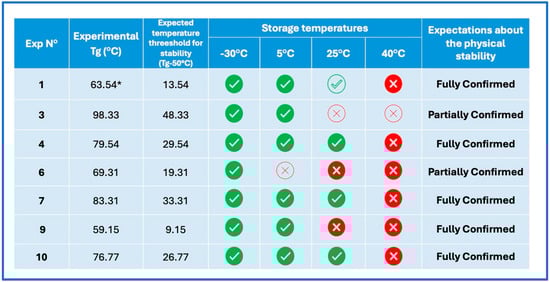 Physical stability of seven coamorphous systems after 6 months of storage at different temperatures. Full sticks indicate that sample meets expectations according to “Tg—50 °C” rule. Full green ticks stand for “stable as expected according to “Tg—50 °C” rule”; full red crosses stand for “unstable, as expected according to “Tg—50 °C” rule”; empty green ticks stand for “stability superior to expectations”; empty red crosses stand for “stability inferior to expectations”. * Tg value calculated from G-T equation.