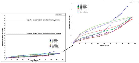 Remaining in the context of physical stability, one of the most critical challenges associated with amorphous and coamorphous materials is their inherent hygroscopicity. These materials have a high tendency to absorb moisture from the environment due to their disordered molecular structure, which creates an increased surface area and more accessible sites for water interactions. The absorption of moisture can generate several negative consequences. Water molecules, once absorbed, can act as plasticizers, lowering the Tg and increasing molecular mobility within the material. This can lead to a destabilization of the amorphous or coamorphous matrix, weakening or completely disrupting the intricate molecular interactions that maintain the material in its high-energy state. Such destabilization brings unwanted phenomena, like phase separation, a loss of cohesion in the coamorphous system, or most detrimentally, recrystallization or hydrates formation. These latter phenomena not only compromise the solubility and dissolution rate advantages of amorphous forms, but also risk reducing the bioavailability [35,36]. Therefore, understanding and meticulously controlling hygroscopicity is crucial to preserving the physical stability of amorphous and coamorphous powders over time. To assess the effects of relative humidity (RH) on the obtained coamorphous systems, selected samples (i.e., N° 3, 6, 9, and 10) were subjected to a gradual RH increase from 0% to 90% at a constant temperature of 25 °C. Figure 8 provides a summary of the sorption–desorption curves for all four coground systems investigated.