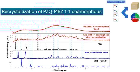 Cartoon depicting the recrystallization of binary PZQ-MBZ 1–1 coamorphous systems into individual components through PXRD analyses. Black dotted lines represent PZQ peaks, while light blue dotted lines MBZ reflections.