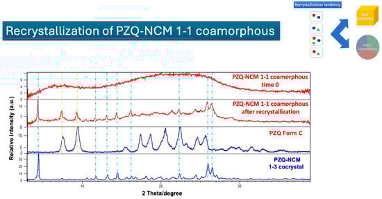 What is particularly intriguing about this coamorphous system is its unique behavior during recrystallization. Specifically, the PZQ-NCM 1–1 coamorphous system transforms into a combination of the well-known polymorph C of PZQ and PZQ-NCM 1–3 anhydrous cocrystal (Figure 10). This indicates a significant change in the stoichiometry between the two components, suggesting that the coamorphous state can influence the pathways of crystallization in unexpected ways.