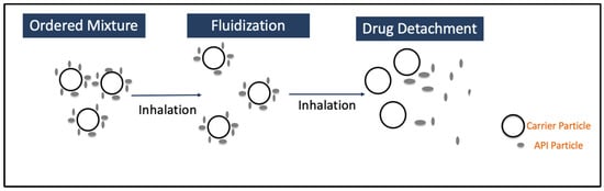 where is the projected cross-sectional area of the particle, U is the velocity of the airstream, is either the drag or lift coefficient, and is the density of air [15]. As the API particles are cohesive and difficult to fluidize, they are often blended with coarse carrier particles usually lactose or mannitol to formulate blends also known as ordered mixtures [18]. The coarse carrier improves the flow properties, provides precise metering, and imparts higher momentum due to its size and density [19]. There are multiple studies performed to establish ways to determine the appropriate carrier for a particular formulation. While selecting a carrier, it is important to consider that it should be readily available, biocompatible, and safe to use in inhalation formulations, and upon inhalation, the API should easily detach from the carrier surface [20,21]. To achieve efficient detachment of API from the carrier surface, it is essential to optimize the cohesive–adhesive balance between the carrier–carrier and carrier–API particles.