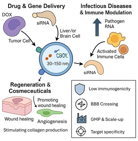 Results: Results revealed treatment with NB60 E significantly reduced surface Trop2 expression across both cell lines by 23.5 ± 1.5% in MDA-MB-468, and 61.5 ± 1.5% in LTLT-Ca, relative to the HEK293T-derived control EVs (HEK293T E). NB60 E treatment resulted in a marked reduction in LTLT-Ca cell viability by 52.8 ± 0.9% at 48 h post-treatment. This was accompanied by downregulation of key oncogenic signaling molecules: phosphorylated ERK1/2 (p-ERK 1/2) decreased by 30 ± 4%, cyclin D1 by 67 ± 11%, phosphorylated STAT3 (p-STAT3) by 71.8 ± 1.6%, and vimentin by 40.8 ± 1.4%. ELISA analysis revealed significant decreases in IL-6 (−57.5 ± 1.5%, 7.4 ± 0.35 pg/mL) and TNF-α (−32.1 ± 0.3%, 6.1 ± 1.2 pg/mL) levels, coordinated by an increase in IL-2 secretion (22.1 ± 2.7%, 49.2 ± 1.1 pg/mL). Quantitative analysis showed marked reductions in the number of nodes (−45 ± 4.4%), junctions (−55 ± 3.5%), and branch points (−38 ± 1.2%), indicating suppression of angiogenic capacity. In vivo experiment using near-infrared Cy7 imaging demonstrated rapid and tumor-selective accumulation of NB60 E within 4 h post-administration, followed by efficient systemic clearance by 24 h. The in vivo results demonstrate the effectiveness of NB60 E in targeting Trop2-enriched tumors while being efficiently cleared from the system, thus minimizing off-target interactions with normal cells. Lastly, Trop2 expression in LTLT-Ca tumor xenografts revealed a significant reduction of 41.0 ± 4% following NB60 E treatment, confirming efficient targeted delivery.